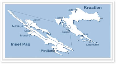 Die kroatische Insel Pag befindet sich an der Adria-Küste nördlich von Zadar in Norddalmatien. Pag hat eine Länge von 58,25 km und ist mit 284,18 Quadratkilometern der Fläche nach die fünftgrößte Insel der Adria. Auf der Insel, auf der Südseite, erreichen Sie eine Brücke, Pag Brücke 340 m lang, von Zadar, dh Posedarje Žigljan oder mit der Fähre im Norden der Insel vom Hafen Prizna. Die bekanntesten Spezialitäten der Insel Pag sind der Pager Käse und Lammfleisch, die Sie auf den Speisekarten vieler Restaurants finden können.